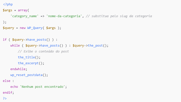 Loop: A estrutura básica do WordPress Loop (have_posts() e the_post()) é usada para iterar através dos posts da categoria especificada.